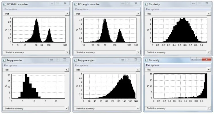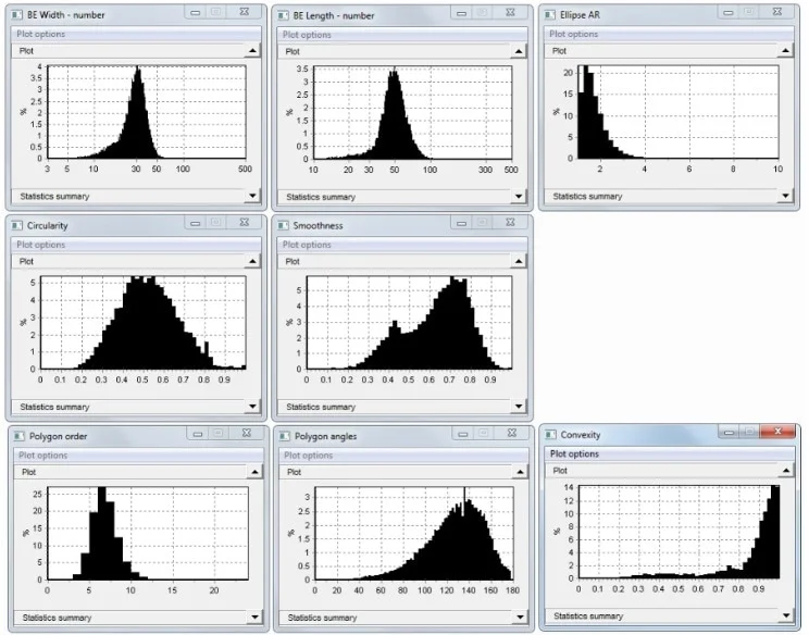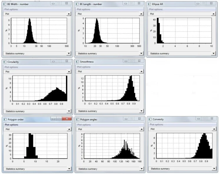 The quantity of fitted polygon sides is measured as polygon order, and the polygon angles category describes the interior angles of the polygon. Convexity indicates the degree to which a particle embodies a convex morphology, in other words how well it matches the fitted polygon. A particle characterized by indented sides would embody a lower convexity than one which filled the majority of the polygon.